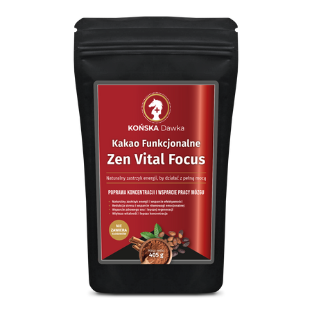 - Odkryj Zen Vital Focus – wyjątkowe połączenie kakao z potężnymi adaptogenami. Zwiększ swoją koncentrację i zyskaj naturalną energię do działania bez zbędnych pobudzaczy. To Twój nowy sposób na produktywny dzień w pełnej harmonii